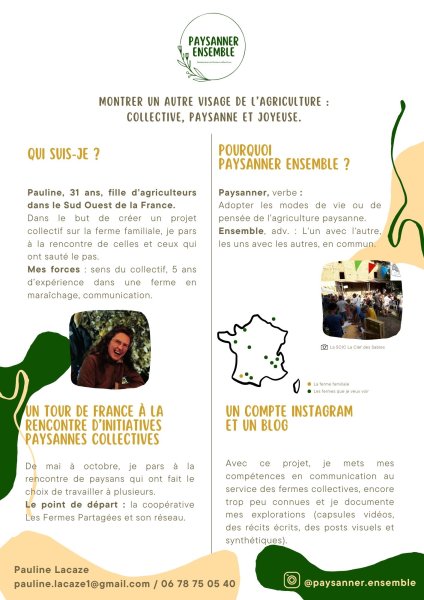 Le projet "Paysanner ensemble" de Pauline Lacaze de déroule de mars à septembre 2025 et est un projet de communication et porter à connaissance des explorations paysannes et collectives sur Instagram pour montrer un autre visage de l'agriculture.